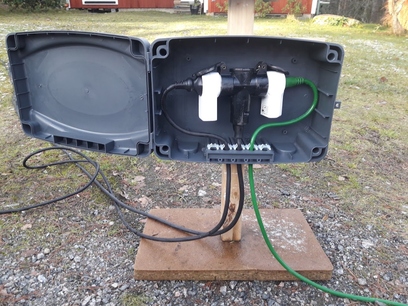 Hittade en fiffig box på Jula med avtätade ingångar för kabel. Var dessutom nedsatt till 99kr när jag köpte den: https://www.jula.se/catalog/el-och-belysning/elinstallation/kabelforlangare-forgrenare/skyddsboxar/skyddsbox-425443/?f.category.code=C-010000&sort.by=novelty&sort.order=desc&skip=25&take ...