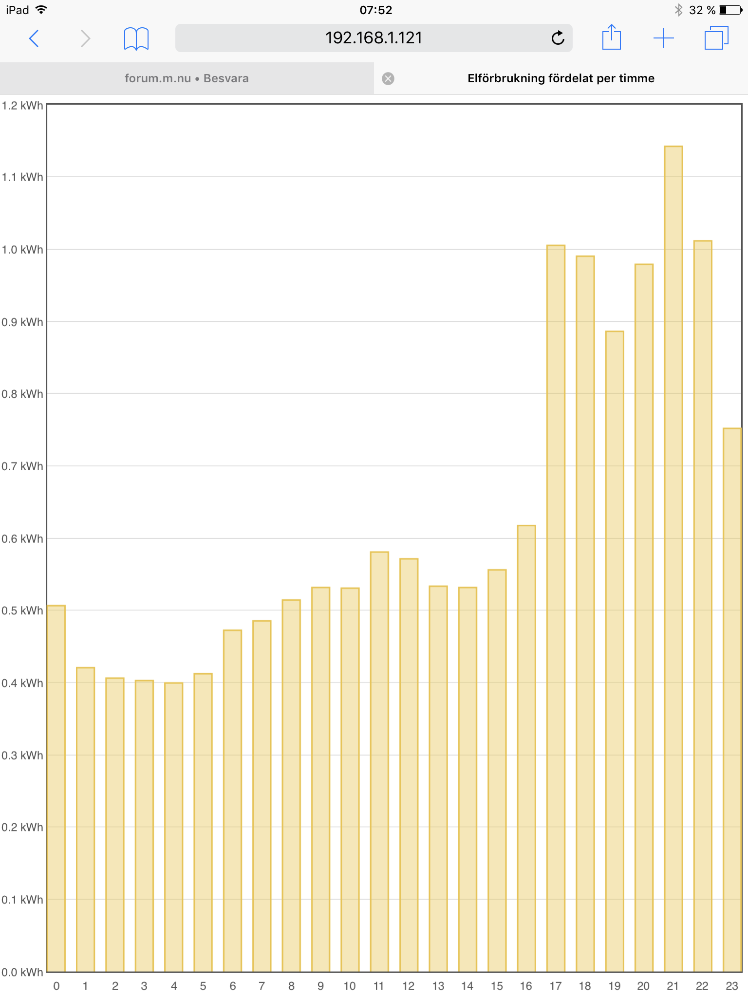Jag har ett skript som går en gång per minut, läser av räknaren och lägger ut värdet "X Watt" där X är antalet uppmätta elräknarpulser senaste minuten multiplicerat med 60. 1/1000 kWh förbrukat under en minut = 60 watt i snittförbrukning. Skulle det komma 10 pulser i minuten under en hel timme motsvarar det 10 pulser x 60 minuter = 600/1000 kWh = 0.6 kWh (eller i klarspråk en snittförbrukning om 600 watt per minut).