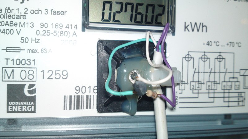 Nu funkar det finfint, extrakostnaden för att min elmätare inte hade S0 blev 19kr för fototransistorn, resten hade jag liggandes :D Jag flyttade över den köpta led-pulsdetektorn till värmepumpselmätaren och satte min hemmagjorda på min huvudmätare, detta eftersom huvudmätaren har IR-diod (fototransistorn från kjell är för IR) och elmätaren för värmepumpen har gul diod. Funderade först om jag skulle försöka göra den "snygg", men den är ju väl dold i fasadskåpet och sådär jätteful blev den ju ändå inte. :)