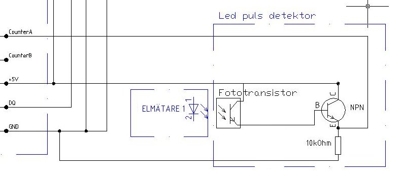 Som gammal elektronikingenjör tyckte jag det verkade lite för tillkrånglat med den LED-pulsdetektor + räknare som finns på http://www.m.nu. Dessutom blir det ju en del pengar om man skall köpa klabbet...