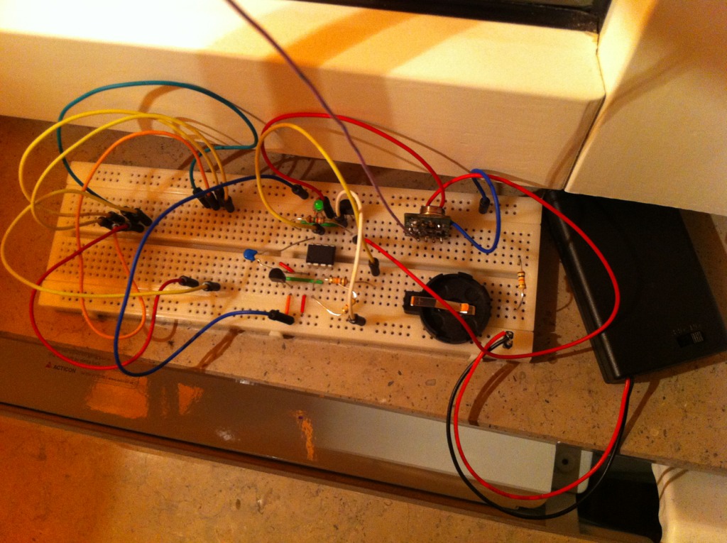 Jag lägger också upp en bild på min testbänk. Just nu matar jag den med tre AAA NiMH, men jag tänkte även testa med ett CR2032.