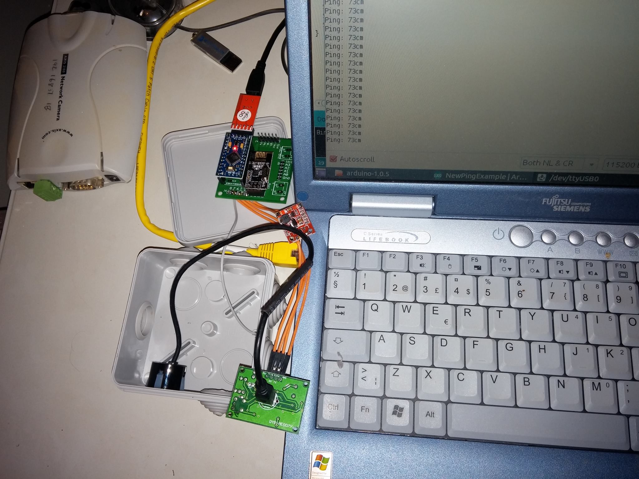 Snödjupsmätare med ultraljud. Den tätade typen av ultraljudsgivare ska in i en låda tillsammans med en arduino pro mini, och ska drivas på batteri. Monteras på gungställningens överliggare och mäter rakt ner mot marken, någon kraftig typ av gallring av mätvärdena lär behövas men det är ett senare problem.