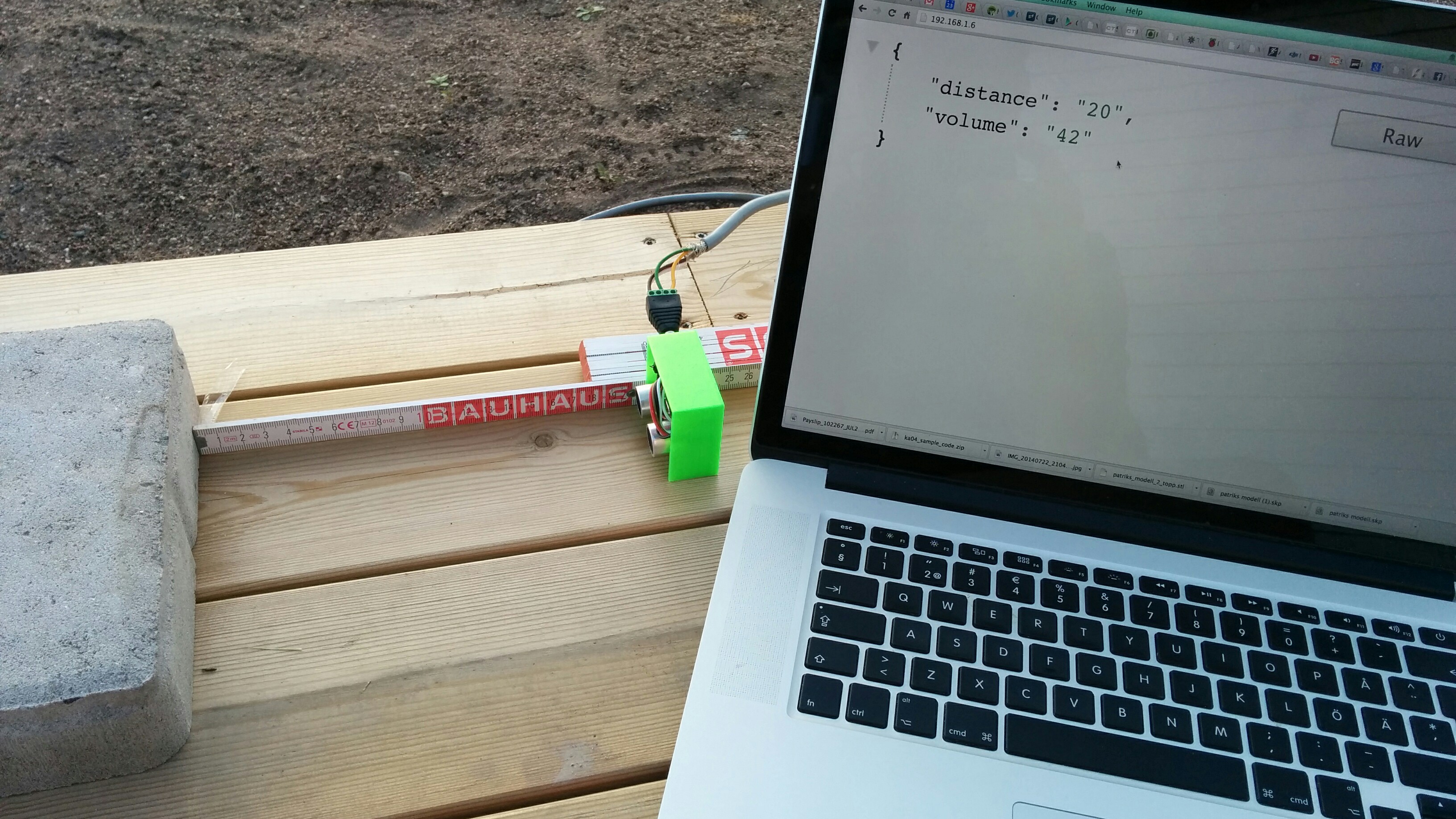 Här provkör jag sensorn med den långa kabeln. "Volume" i json-svaret är bara en dum placeholder för tillfället.