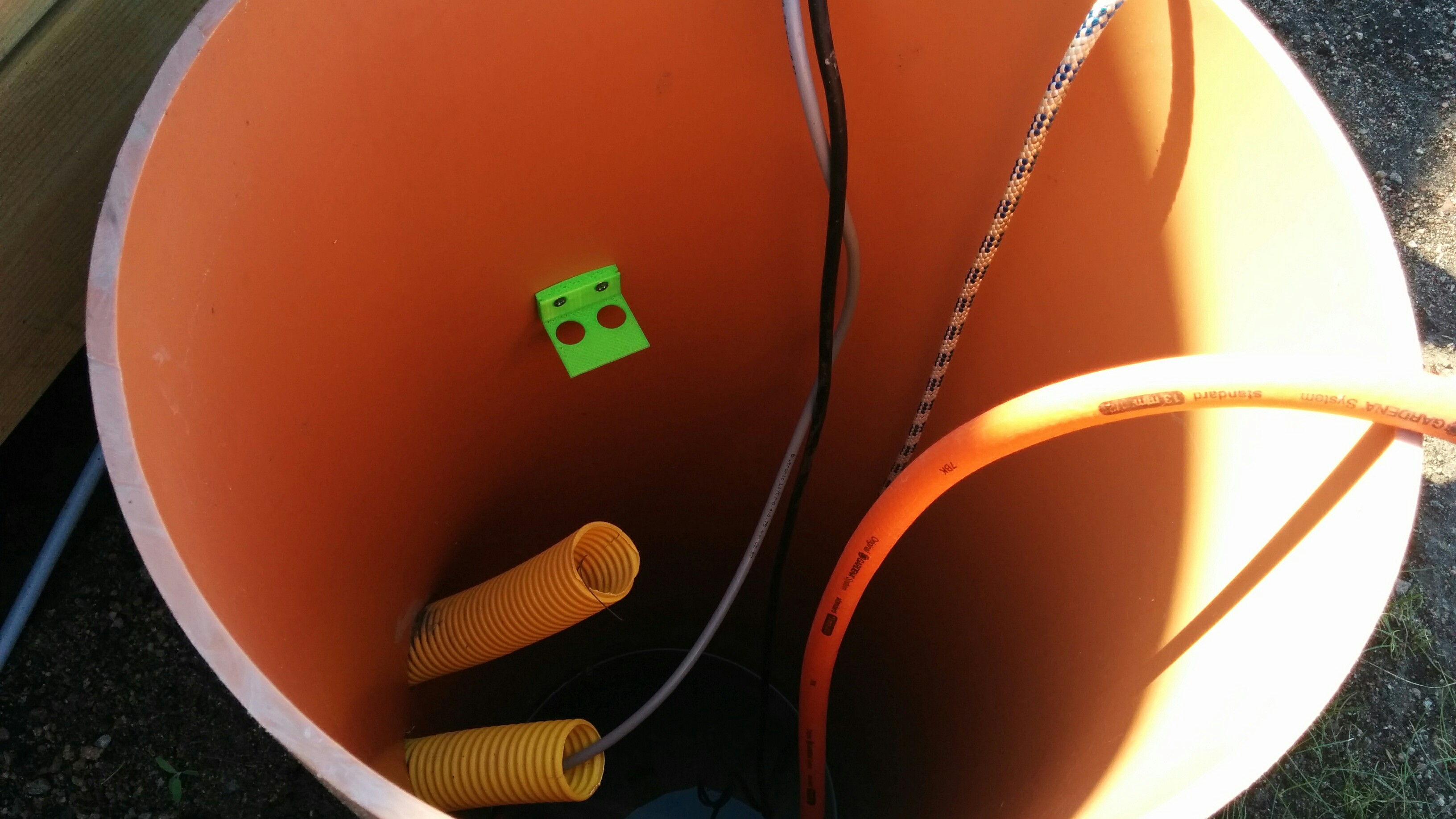 När vi anlade tomten så passade jag på att gräva ner två rör från förrådet ut till tanken för just ett projekt som detta. I förrådet är det tänkt att en Arduino ska sitta, ansluten till en ultraljudssensor (HC-SR04) monterad i röret ner till dagvattentanken.