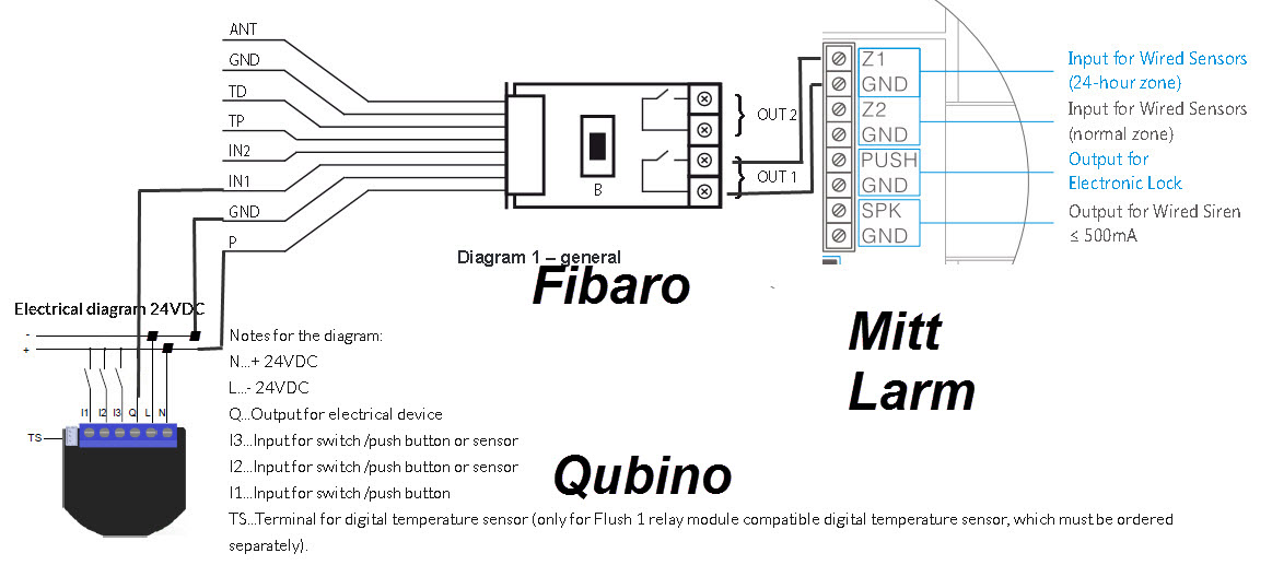 Nu kommer jag med en lite jobbig fråga :) Det är såhär att jag har försökt att ansluta fibaro universal sensor till mitt hemlarm (Se bild) men jag fick inte det till att fungera så jag ställde frågan i ett forum och jag fick som svar att det inte gick att styra utgångarna på fibaro sensorn med zipaboxen för att sensor var beroende av ingången :( Nu ställer jag frågan till er proffs :) Vad och hur kan jag koppla på ingången till fibaro sensorn för att trigga mitt larm. Skulle vilja sätta upp regler i zipaboxen så om vissa sensorer triggas eller vissa brytare är på/av så ska dem trigga utgången på fibaro sensorn. Har hört att man kan använda sig av puckar och reläer men jag vet inte hur.