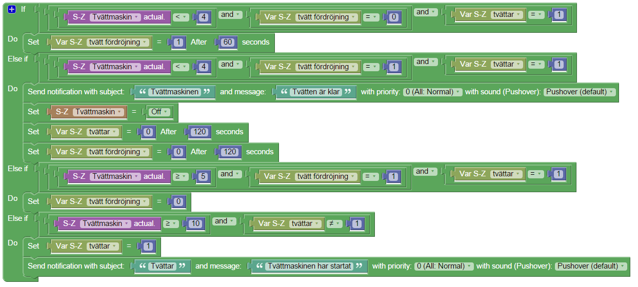 Därefter anpassa variablarnas namn så de stämmer överrens med ditt system, notera att local switch_washingmachine används inte, och att jag har inte konfigurerat mitt system för ÅÄÖ så min Tvättmaskin heter Tvattmaskin.