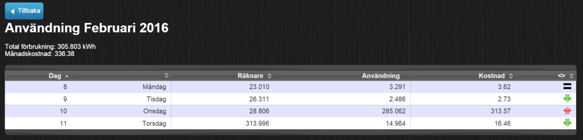 -- Om annat uppdatera fel med +1, uppdatera senaste lästa värde och använd senaste avläsning till totalen.