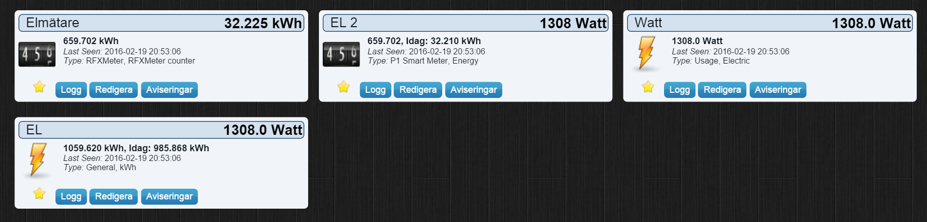 Den som heter EL är helt åt skogen som synes. Vissa blir också delade med antalet blink som man anger i inställningarna för Domoticz. Jag har försökt att presentera data till de virtuella sensorerna på alla möjliga sätt utan att få det rätt. Jag har också frågat i Domoticz forum men nu har det gått några dagar utan svar.