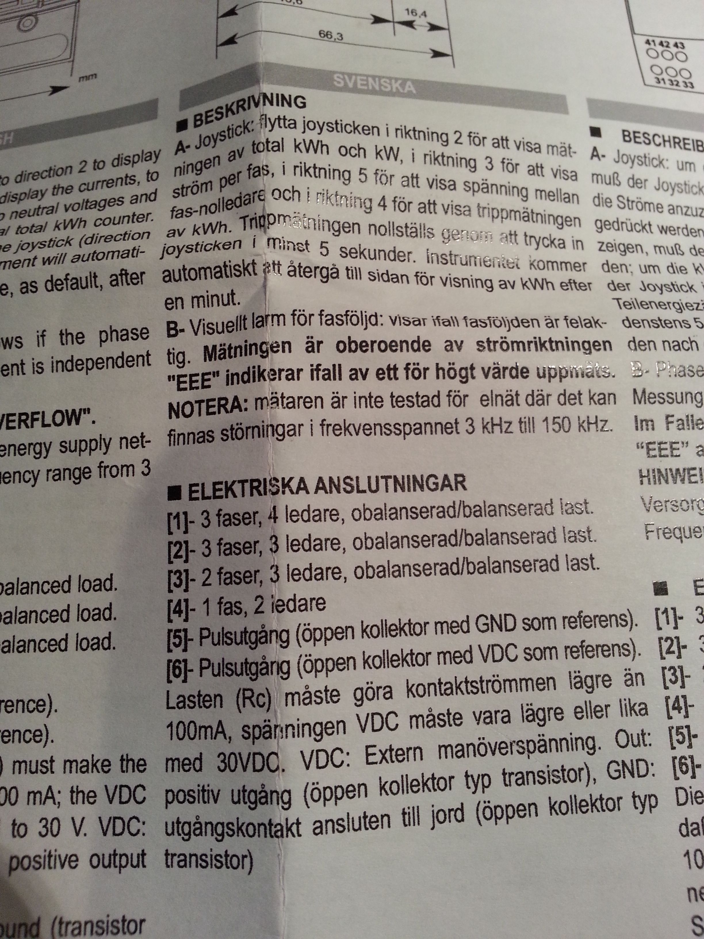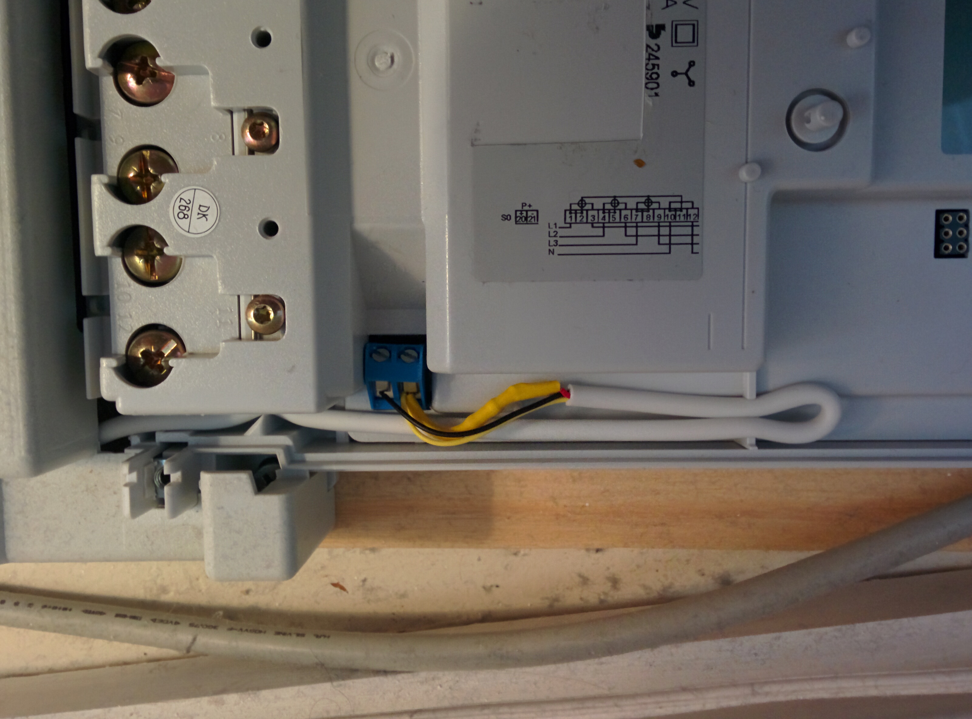 Nu har jag kollat mina kopplingar. Jag mindes delvis fel för två av de tre mätarna jag har är kopplade på S0-utången och med ett motstånd. Den tredje sitter nere i krypgrunden så den har jag svårt att kolla men är rätt säker att jag kopplat den på de sex små förgyllda hålen. Det var det som var så konstigt, minns jag nu, att jag inte fick samma lösning att funka på alla tre mätare av samma modell.