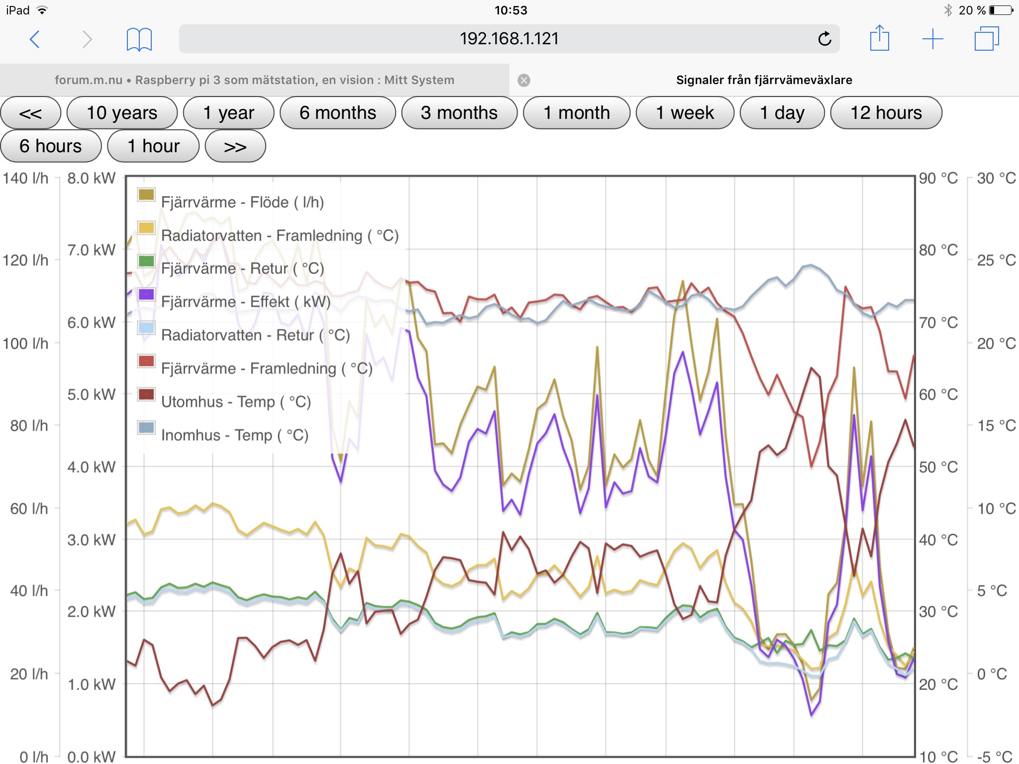 Jag tänker börja med att bygga ett system för att mäta en ute temperatur. Som hårdvara vill jag använda raspberry 3 och ds18b20 sensor. Till detta behövs naturligtvis ett operativsystem till raspberryn, owfs samt rrd-tool. Jag har hittills fått raspberryn att läsa temperatur, men då jag är extrem nybörjare på området tror jag att jag fipplat lite för mycket med systemet och den databas med temperaturer som skapas blev på 12 timmar 6mb stor, så någonstans har nog för många värden sparats. Ev kan jag ha valt fel operativsystem, Noobs kanske är en version som inte riktigt funkar med de guider jag hittat här på m.nu och andra ställen. Ska testa en ny vända men med ubuntu istället https://wiki.ubuntu.com/ARM/RaspberryPi Ett problem med Noobs var att användarrättigheterna strulade, efter flera försök att få rrddata att fungera, det som jäklades var behörigheterna att skapa mappar. Men jag hittade det lilla kommandot sudo su som gjorde att allt inskrivet efter detta skrevs som superuser och då skapades mappar, men jag fick likväl inte till grafgenereringen. Så därför tänkte jag följa denna guide till punkt och pricka denna gång: https://wiki.m.nu/index.php/OWFS_HowTo