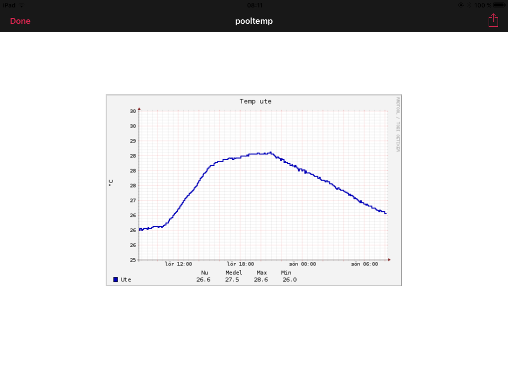 Hade ett himla bry kring vad fasen som orsakade den något hackiga bilden, datan är från samma sensorer sparade till två olika rrd-baser och ritade med likadana script. Båda körs från cron, exemplet på m.nu, där man kör var 5:e minut med en sleep-funktion på 150 sekunder. Men den nedersta... Missat filsökvägen i sleep-raden, tog en halvdag att upptäcka det felet