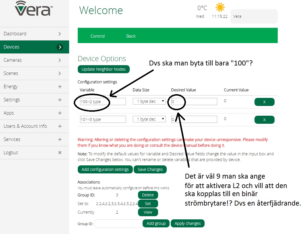 - Sedan ska man tydligen ta bort enheten från systemet när man lagt till parameter 100, utan att den tappar denna inställning och det är detta som jag inte lyckas med. Hur jag än gör, så blir "Current value" = 0 (istället för 9) för parameter 100 varje gång jag lägger till Qubinon till Veran.