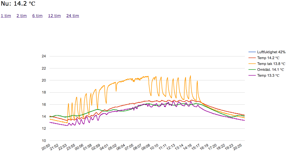 Värdena visas i diagram med Google Charts. 48 timmars "realtid" (ca 2 värden per minut) sparas. Äldre konverteras till timvärden: snitt, max, minimum och antal mätpunkter.
