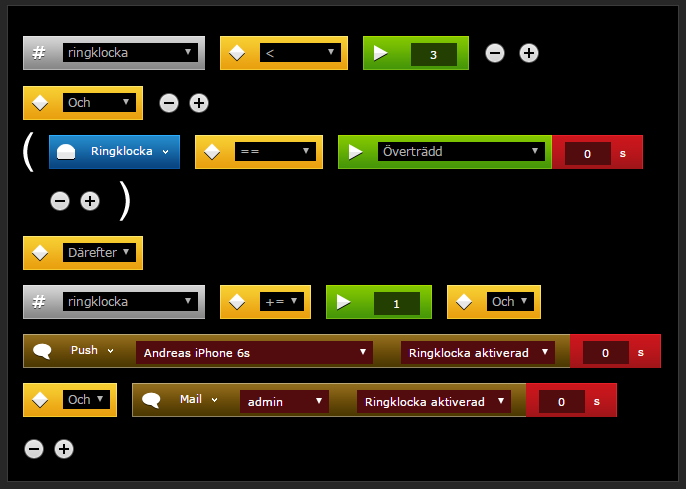 Blev inte helt den suksessfaktorn jag hadde hoppats på. Det jag kanske kan få till med detta är ju att gör att lua eller blockly script som känner typ "changed" state som triggar en reaktion, som samtidig triggar ETT pushmedelande och inte 12 eller 24, värje gång det ringer på dörn.