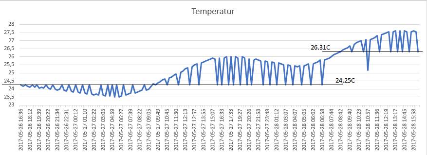 Jag bifogar en bild på de senaste mätningarna. Som man kan se fungerar sensorn bra (det är poolvattentemperatur under natten), men varje timme återkommer den första mätningen 24.25C, wake up time på enheten är satt till en timme.