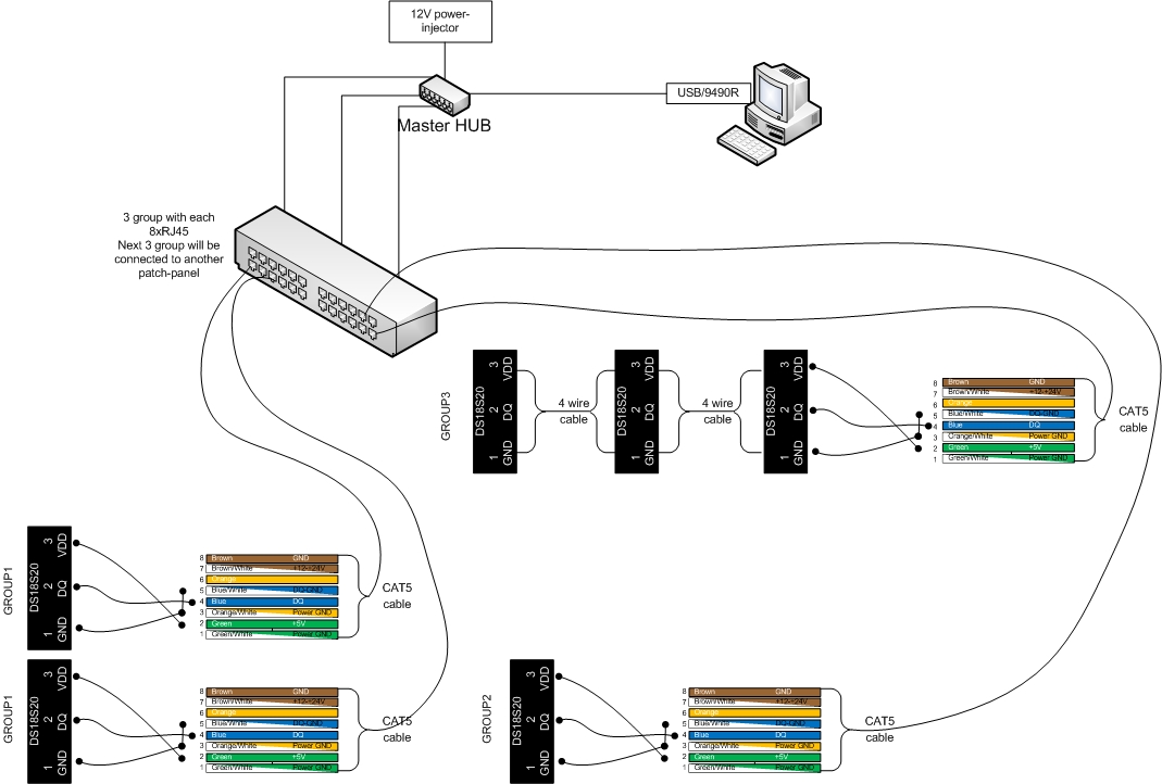 rune, som jag förstår dig har du flera sensorer på samma 8-grupp i patchpanelen. Är det alltså en sensor/RJ45-uttag? Hur har du kopplat ihop uttagen inom 8-gruppen med varandra och master HUB:en?