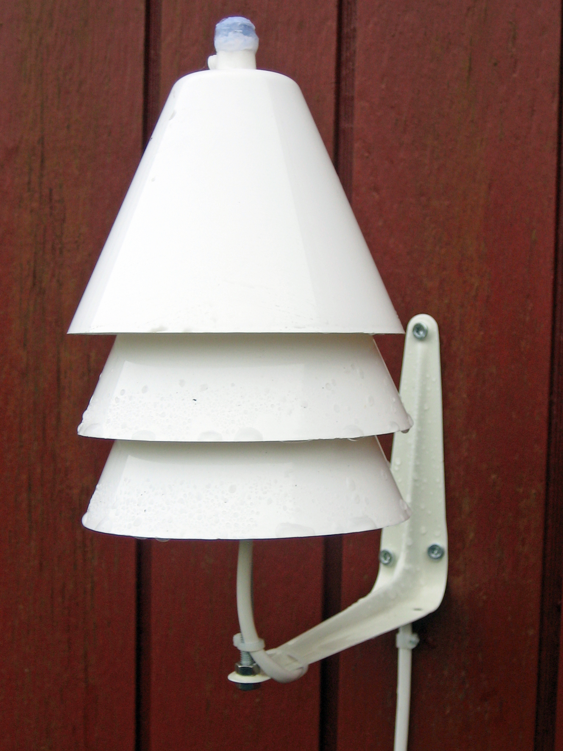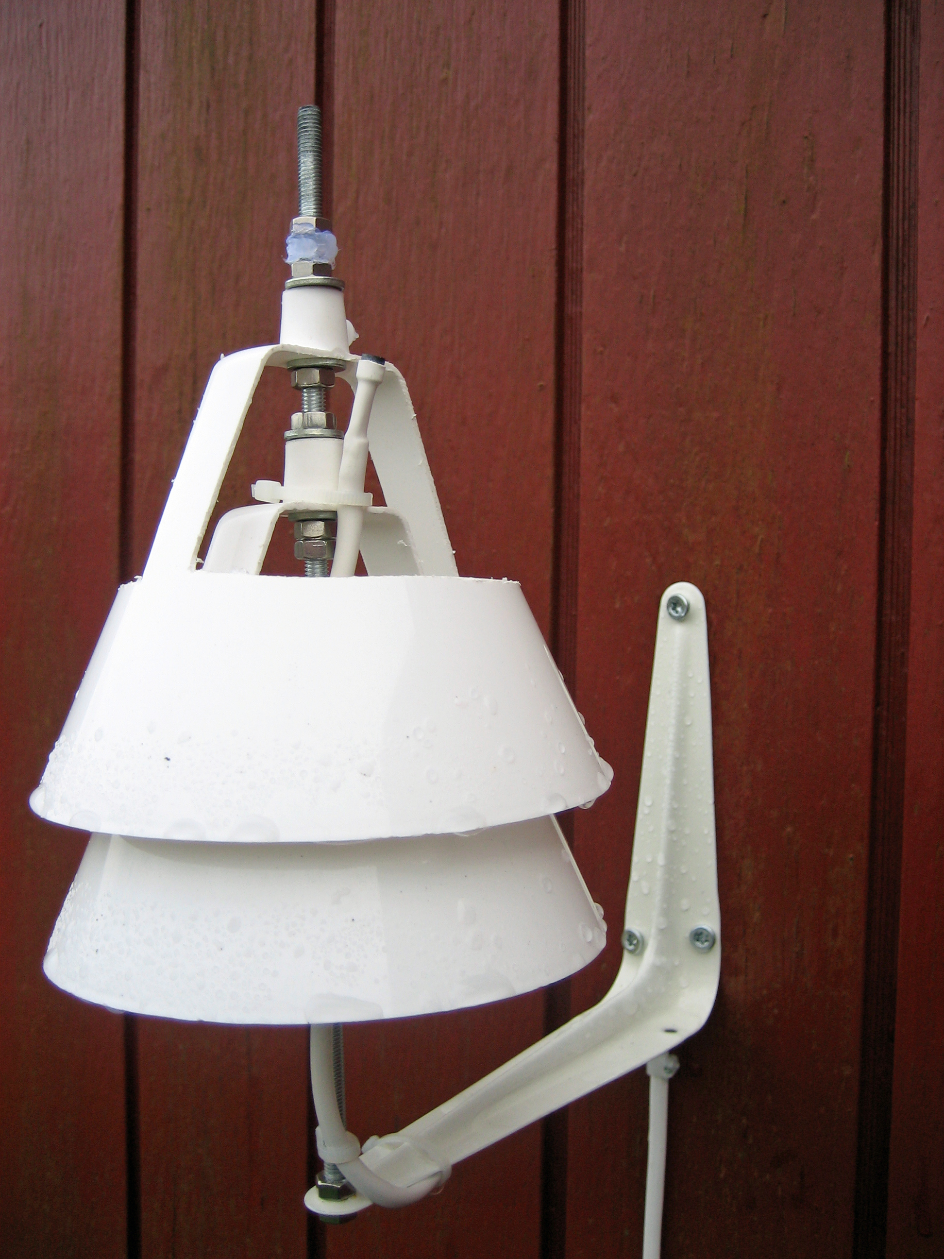 Jag har byggt en egen Stevenson Screen av några lampkåpor, en gängstång, en konsol och några muttrar. Sensorn sitter monterad på norr sidan av vårt förråd.