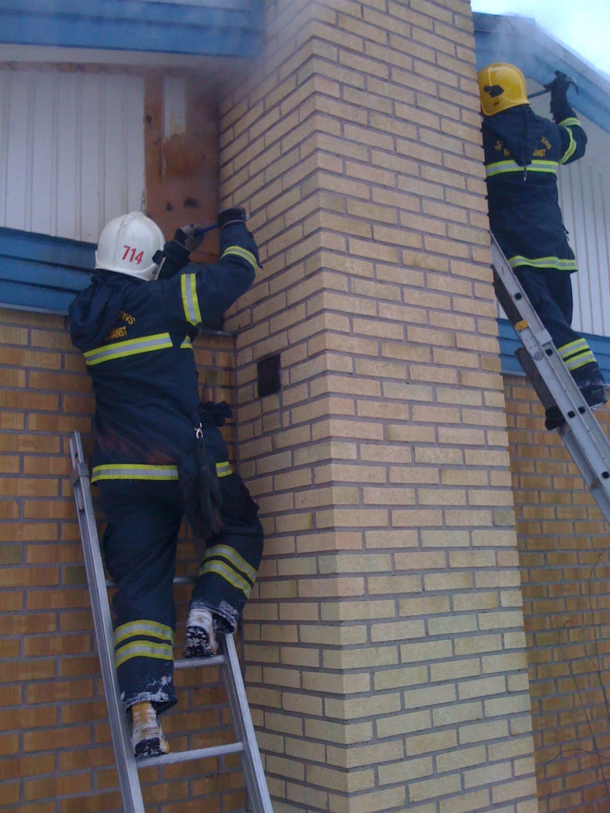 Först tog de skärsläckaren och skar upp ett runt, rätt stort hål i dörren till lägenheten. Sen bultade de fast en stor djäkla fläkt (och såg till att dörren till trapphuset var öppnad.)