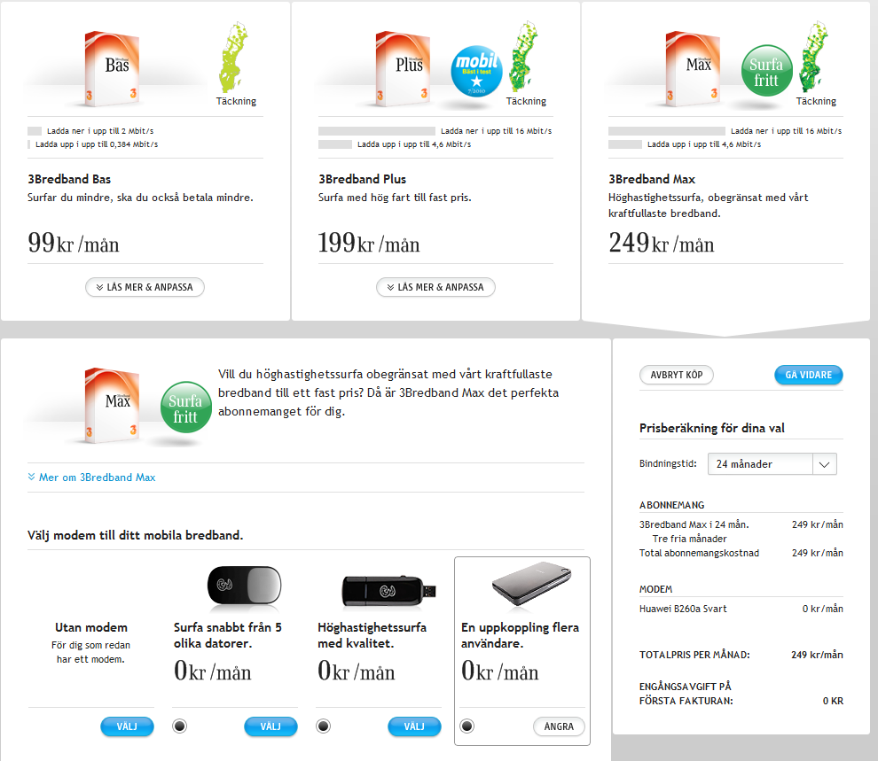 Slutsatsen är alltså att man - om man vill dela sitt mobila bredband - måste ha en egen gateway med ett annat modem, t.ex. Huawei 1820 som stödjer HSPA+ standarden för att uppnå den utlovade hastigheten. Och då kan man lika gärna välja Tele2 som är 15kr billigare för samma produkt.