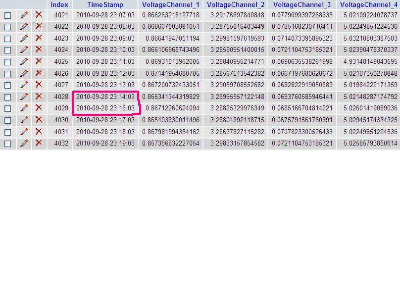 För tillfället pollar jag CO2-mätaren en gång i minuten och I/O-kortet en gång var 15:e minut. Värdena från CO2-mätaren fungerar bra i 14 minuter men samma minut som I/O-kortet skriver sitt värde (skiljer 3 sekunder mellan när CO2-mätaren skriver sitt värde och I/O-kortet sitt) tar CO2-mätaren paus en minut. Bifogar ett utdrag ur mysql-databasen där detta framgår var 15:e minut.