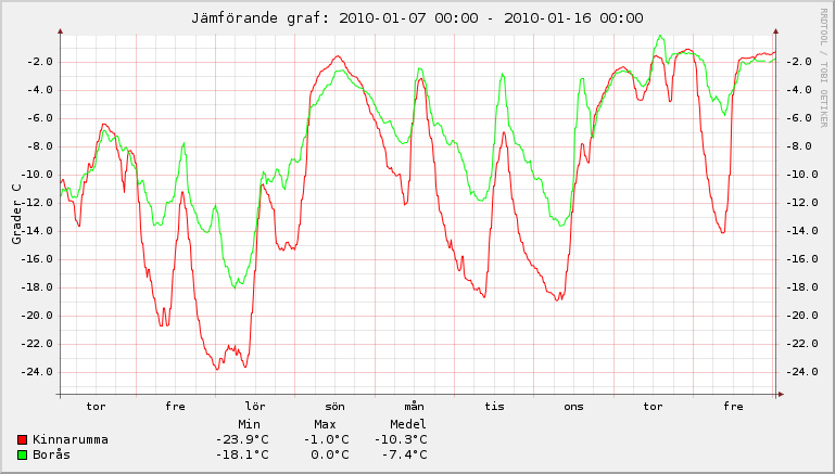 Den jämförande grafen är från Borås (tror ni förstår vilken graf som tillhör Kinnarumma) 1,5 mil. Det har skillt 12 - 13 grader när det varit kallt. Se grafen. Det extremaste är nog natten fre - lör precis 00.00, då tempen i borås steg..