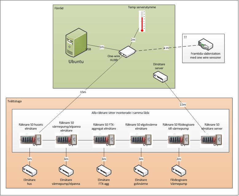 Om du sätter räknarna när varandra med en "lång" kabel till varje S0 går det utmärkt med en enda slinga och inga hubbar. Exempelvis din 15-meterssträcka bli då två kablar, en 1-wire och en S0 brevid varandra för att kunna använda samma räknare till vattenpump och server. Då behövs samma prylar som jag skrev ovan, en USB, tre räknare, kabel och grenar.