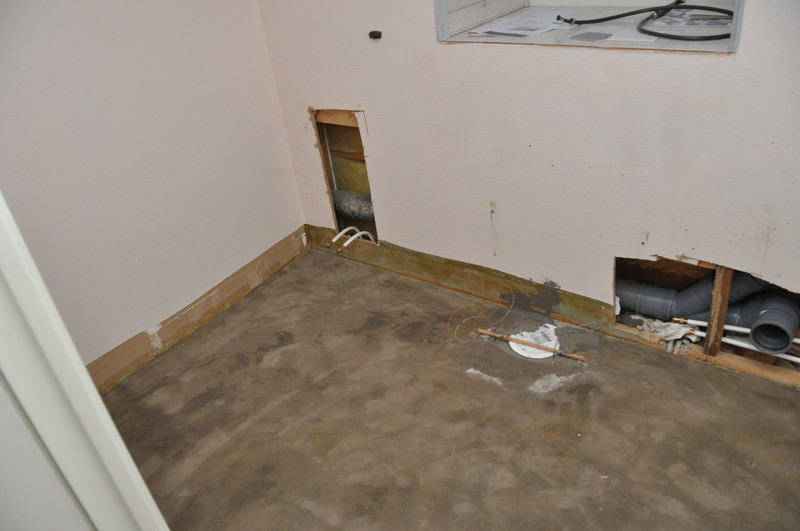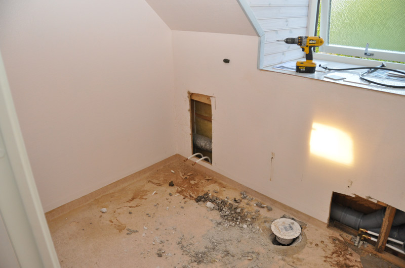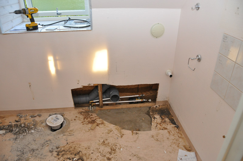 Väggar sågades snabbt upp och golvbrunnen togs bort. Rör flyttades och avlopp till toaletten drogs om. Mycket gjort på kort tid.