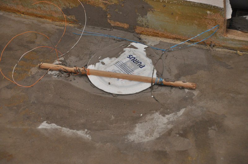 Ny golvbrunn skall monteras. När de tog bort den gamla råkade de göra ett 20x20 cm stort hål rakt genom golvet. Som tur är är det en ventilationskanal nedanför så misstaget/hålet kommer inte att synas alls.