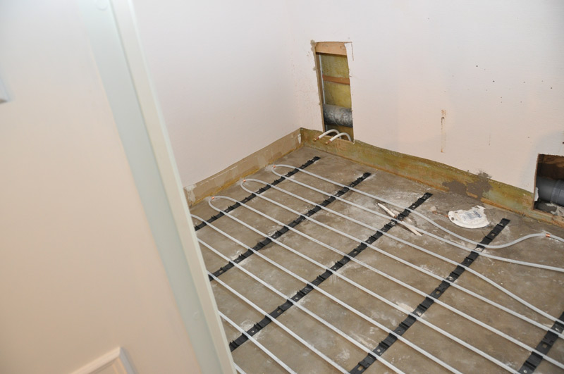 Vi rev ut allt, "slängde" ut det inmurade gjutjärnsbadkaret och bytte till dusch (med unidrainbrunn), bytte plats på handfat och toalett (numera vägghängd), lade in golvvärme (vattenburen).