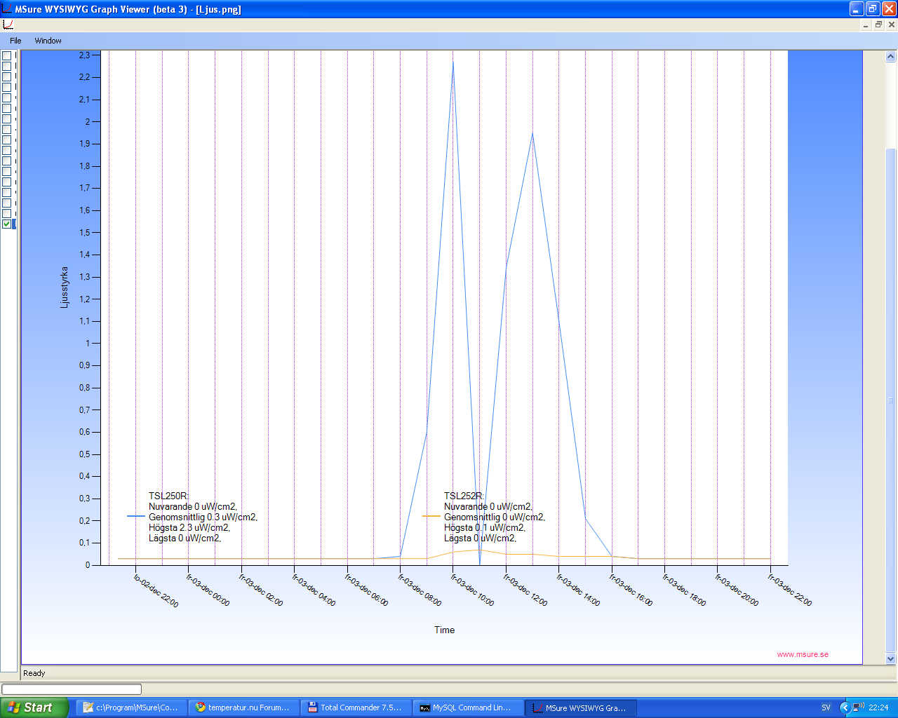 Jag medelvärdesbildar mina värden under en timma och får följande resultat för TSL250R: