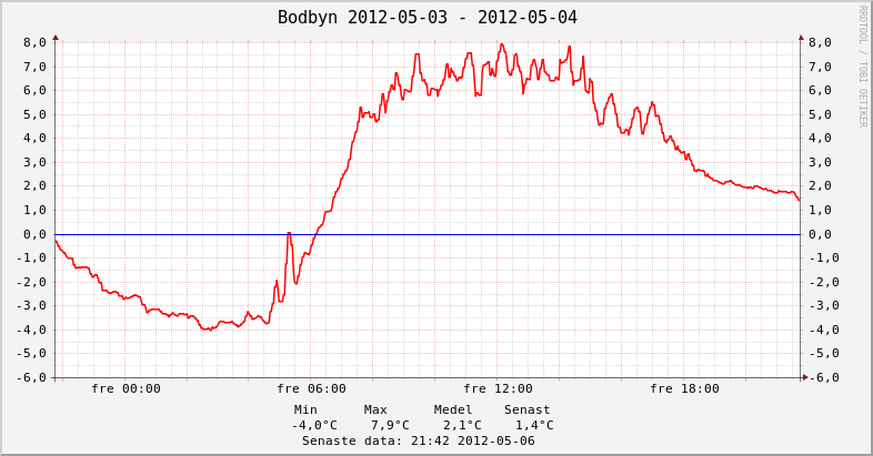 Jag fick ett falsklarm på min sensor på http://www.temperatur.nu/norsjovallen.html nu ikväll. Den tror att det är en solspik kl 12:20 men då är sensorn i skugga.