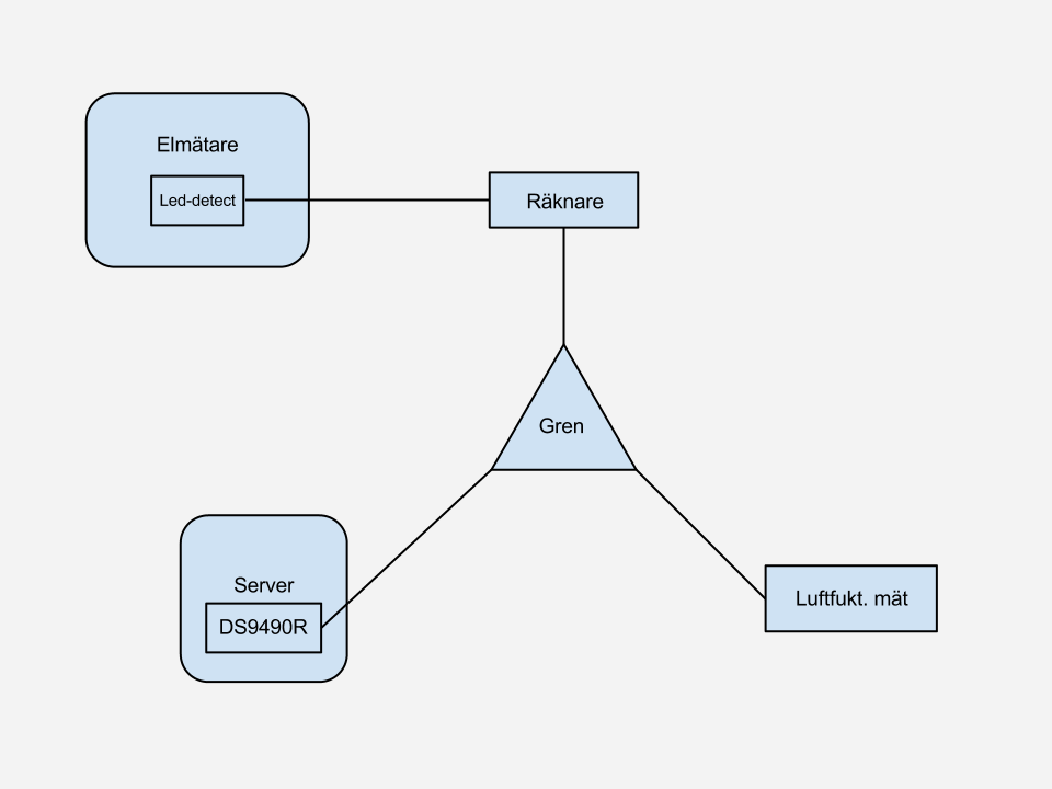 Med detta utseende på nätet menar jag att det enda som om man ska följa alla rekommendationer ska göra kort, är kabeln mellan grenen och luftfuktighetsmätaren, ELLER mellan grenen och räknaren. Tänk nätet som en enda lång kabel med så korta utstick till sensorerna som det går.