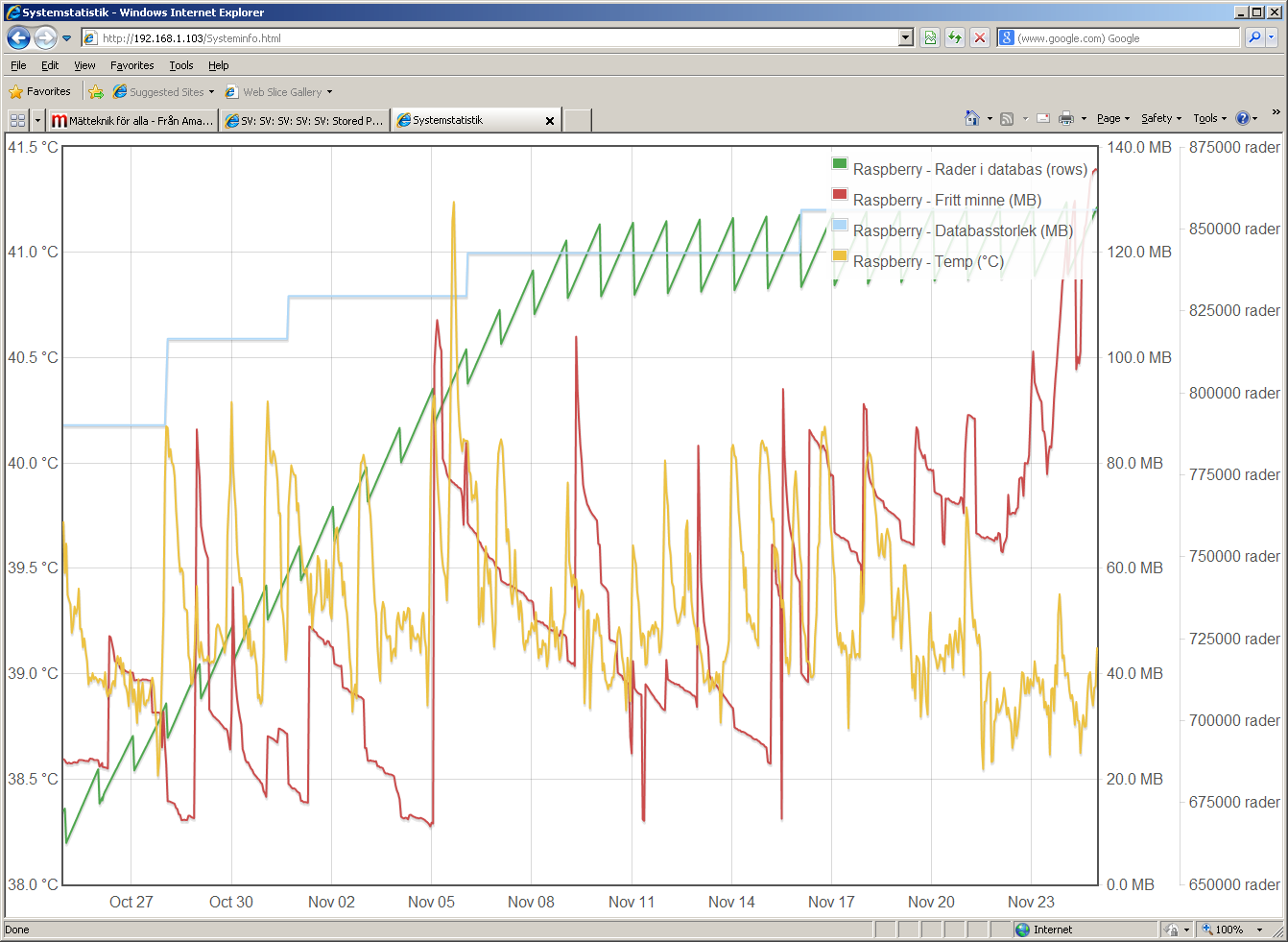 Grön kurva är antalet rader i databasen och den planade ut för c:a två veckor sedan då antalet rådatavärden (fn c:a 725000 st) inte längre stiger eftersom jag raderar allt rådata äldre än 35 dagar varje natt.