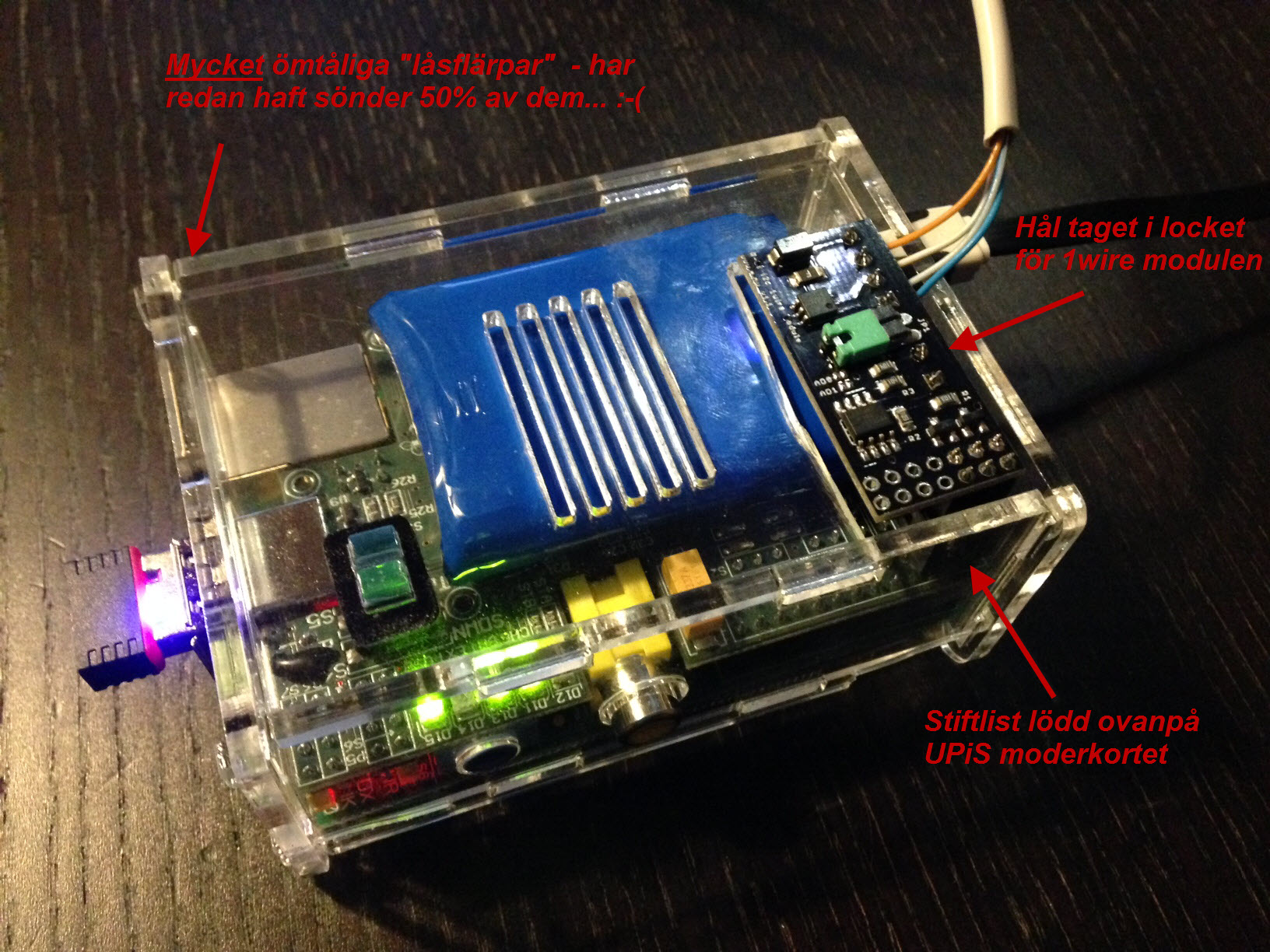 Jadu grelle, det tog lite längre tid än beräknat - men nu har jag dockat min UPiS, en RPi och en 1-wirebusmaster (som jag fick löda dit en stiftlist för o dessutom såga upp locket för att få plats med)grelle skrev:Ä är det någon som har något svar eller erfarenhet kring att använda denna UPS tillsammans med Razberry modulen ?