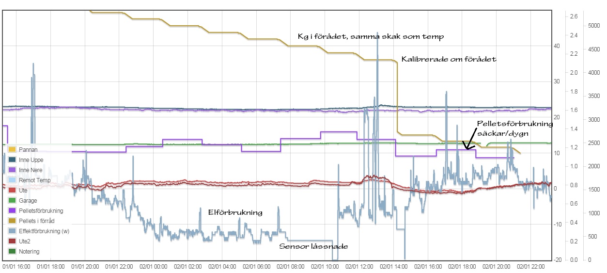 Bifogar en graf som jag får ut. Intressant att se hur pelletsförbrukningen ändras med temperatur ute och med varmvattenförbrukning.