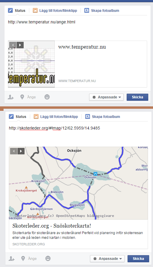 Ett förslag från mig är att kunna dela t.ex. http://www.temperatur.nu/ange.html och då ordna så att "Open Graph" fungerar och läser in en bild på sin graf på de senaste 12 timmarna eller vad som kan vara lämplig tid. Även en text.