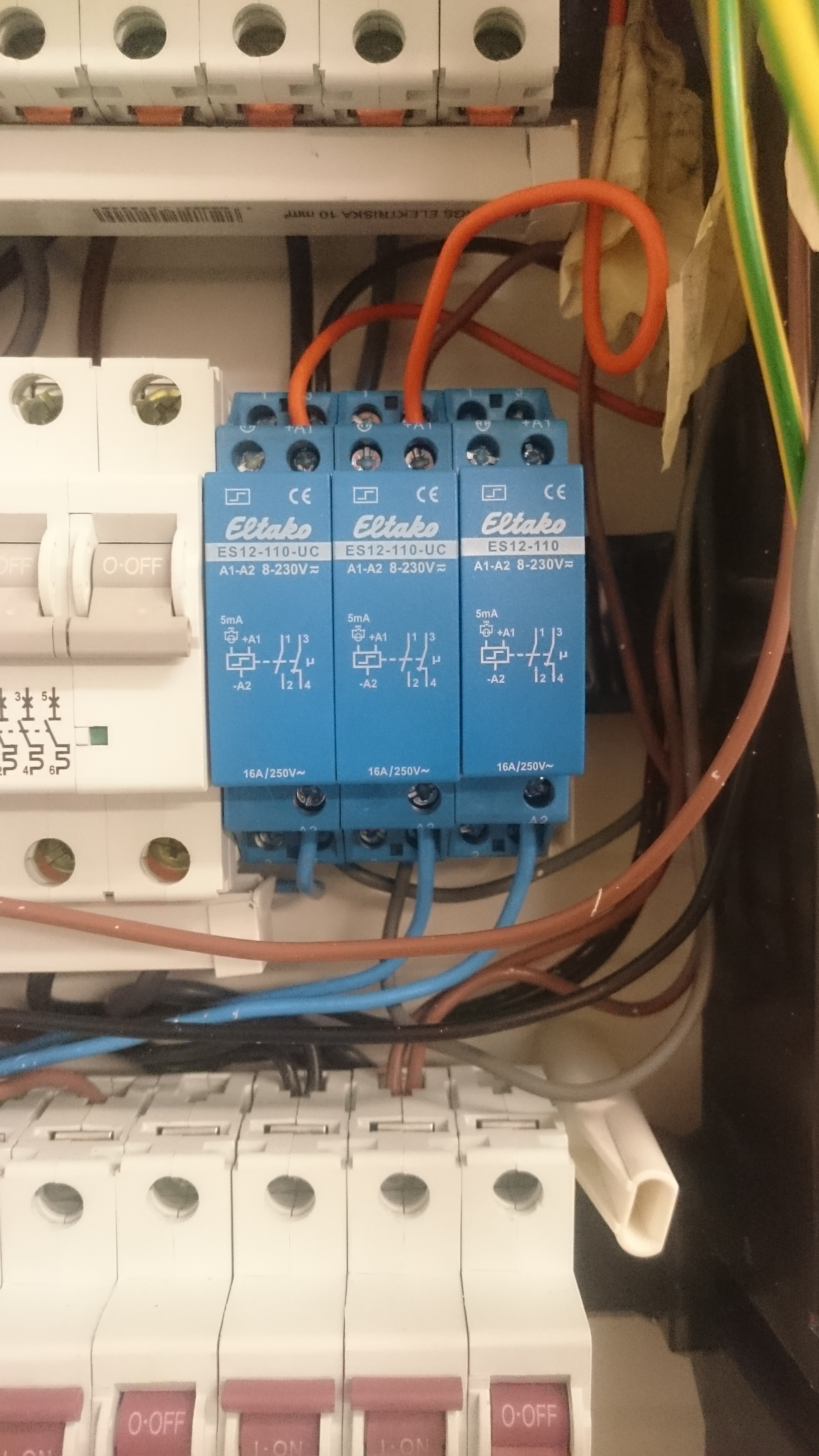 Någon här som kan ge mig (eller snarare min elektriker...) en skiss på hur jag kan koppla in en Fibaro brytare (2X1,5kW - Fibaro FGS-222) till en DIN-kontaktor i elskåpet. Som det är kopplat nu (innan z-wave installationen) så har jag fyra olika strömbrytare med återfjädrande knappar (en vid varje dörr) som tänder/släcker ett antal lysrörsarmaturer (totalt 576W). Detta har jag i tre olika rum. Därav tre kontaktorer på bilden (varav den ena inte är inkopplad än)