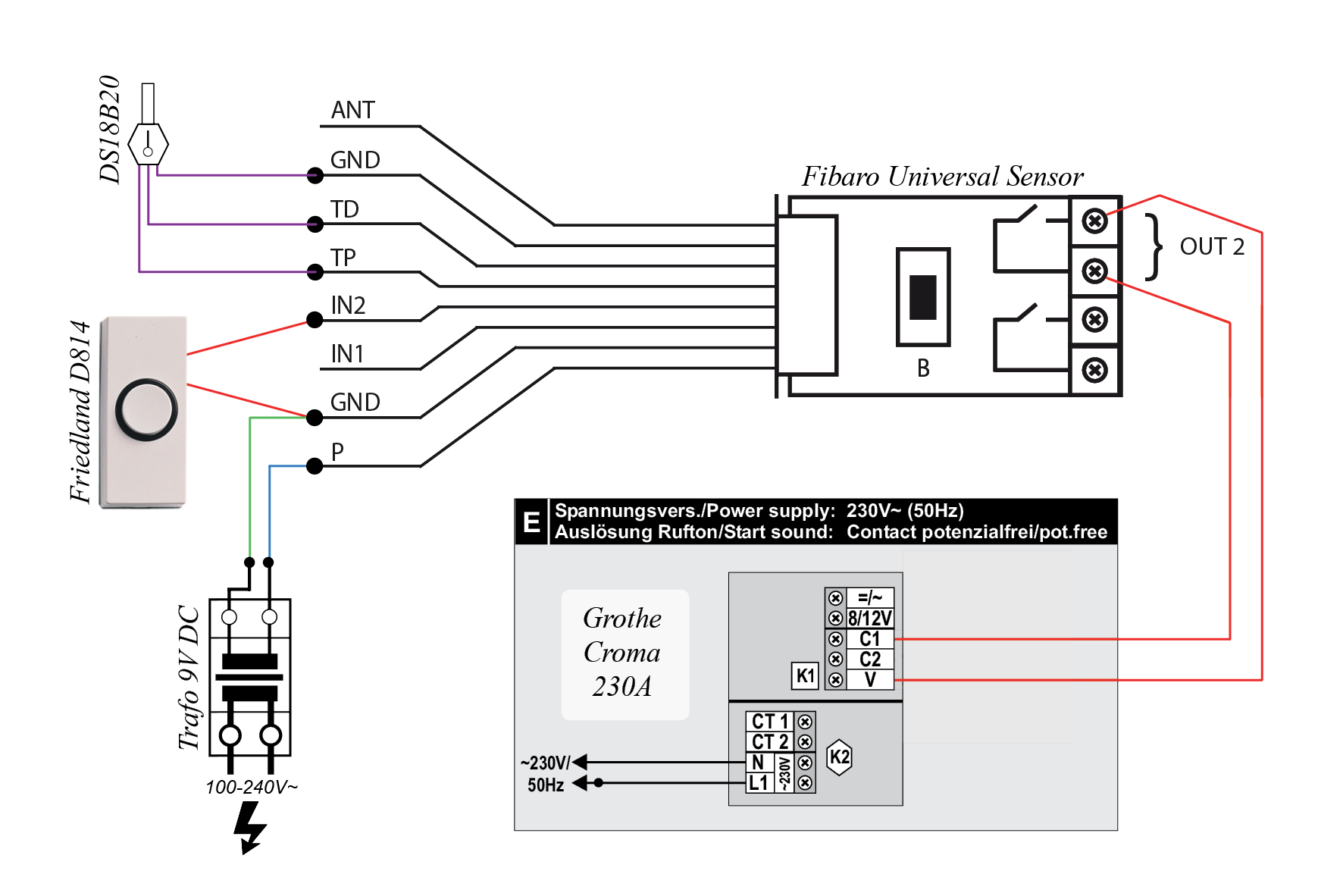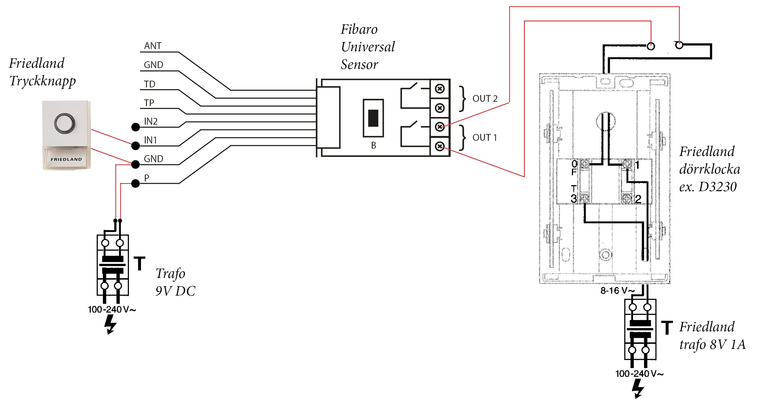 Ingen risk att jag bränner Fibaro-sensorn? Dörrklockan drivs av en 8V trafo och jag leder ju detta genom OUT 1...