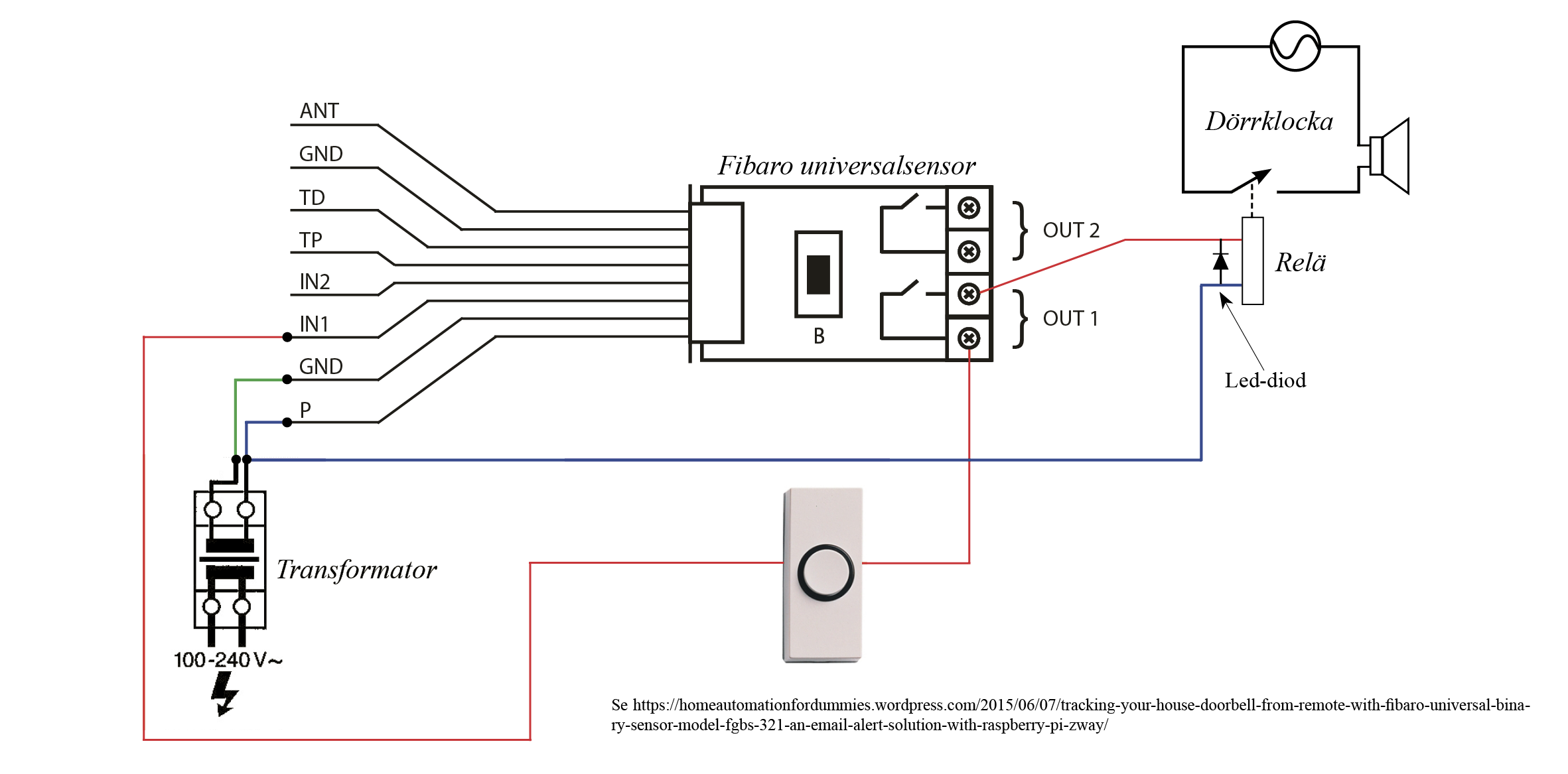 En annan lösning, som också inkluderar Fibaros universalsensor, har föreslagits av "Home Automation for Dummies" (https://homeautomationfordummies.wordpr ... y-pi-zway/), se skiss 2. Eftersom Fibarosensorn är för klen för att på egen hand driva en elektromekanisk dörrklocka, har de stoppat in ett relä som startar när kretsen sluts i Fibarosensorn (dioden är till för att återcirkulera strömmen så att Fibarosensorn inte skadas).