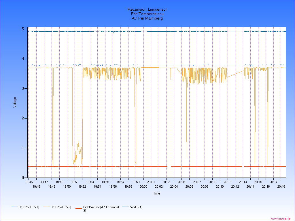 Efter inledande felsökning av lödfelet så gick det fort att få upp en graf som tydligt visar skillnaden mellan de två olika sensorerna (TSL250R & TSL252R) som mitt exemplar levererades med.