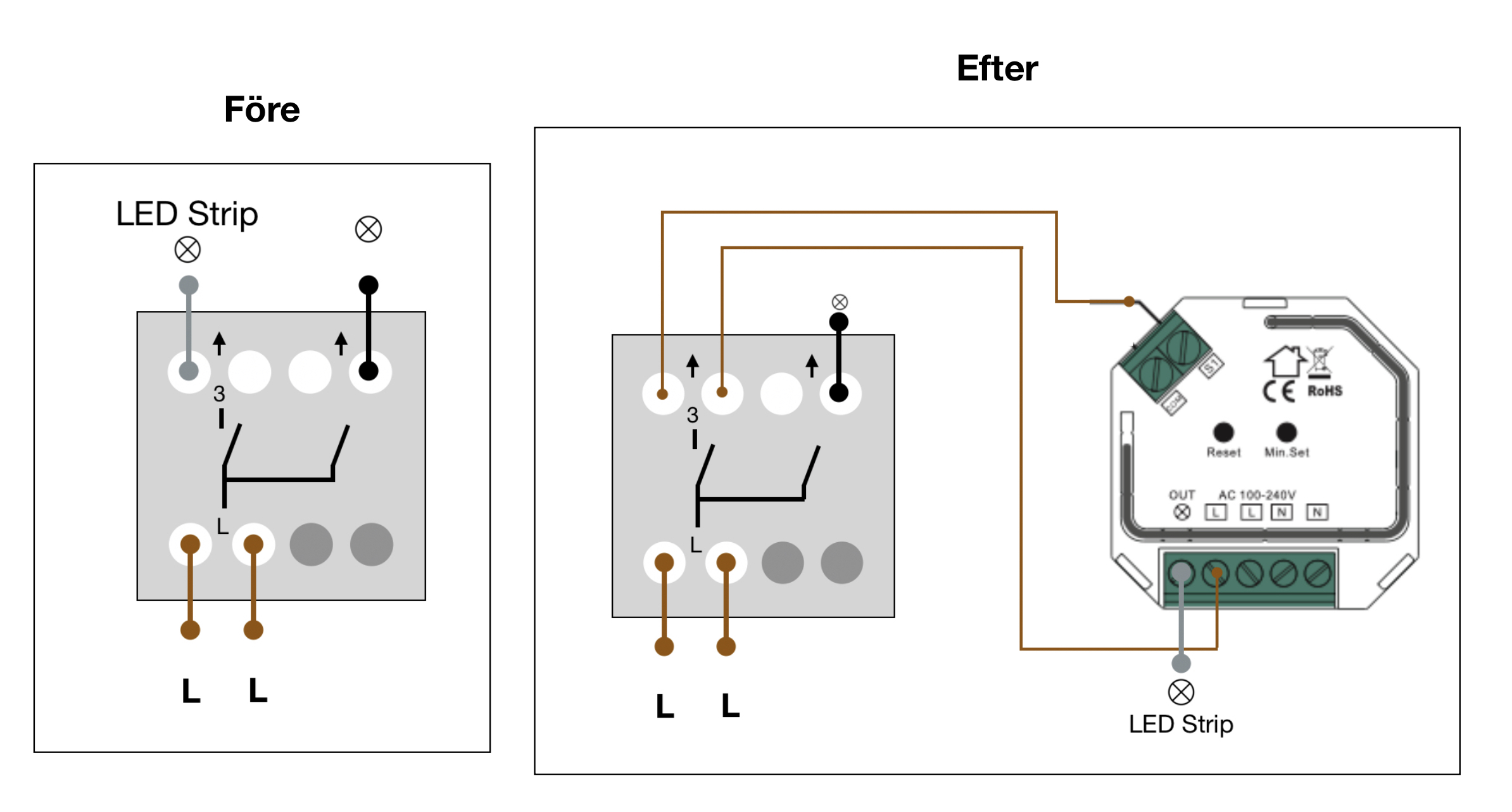Jag köpte en inbyggnadsdimmer ZigBee SR-ZG9040A som kopplas till en LED driver (20W/24V) som i sin tur är kopplad till en LED strip.